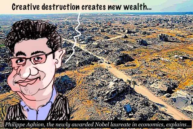 LIFE AND DEATH IS THE ESSENCE OF CREATIVE DESTRUCTION… THIS HAS BEEN THE MESSAGE FROM MR GUS LEONISKY FOR MILLIONS OF YEARS… THUS THE THEORY PUSHED BY PROFESSOR PHILIPPE AGHION THAT GAVE HIM THE NOBEL PRIZE IN ECONOMICS IS A STEAL FROM NATURAL LAWS — AND FROM SCHUMPETER, WHO STOLE IT FROM THE SAID NATURE AS WELL. WE KNOW. THE JEWISH SURVIVAL CODE IS BASED ON THE SAME PRINCIPLE — A PRINCIPLE THAT ISRAEL HAS APPLIED WITH FERVOUR IN GAZA, ON THE FOOTSTEPS OF A DUDE CALLED HITLER… ONE DOES NOT CREATE SOMETHING WITHOUT DESTROYING SOMETHING ELSE. ALLELUYAH…
