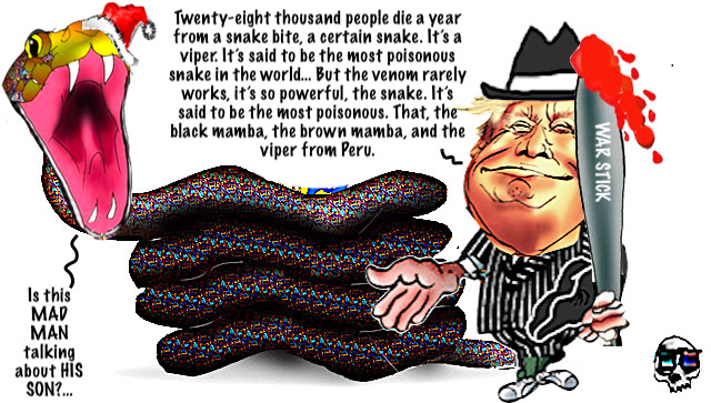 Guests at the White House Christmas reception fell silent Sunday as President Donald Trump veered way off topic to deliver a cozy holiday tale about … poisonous snakes? “Tale” is probably giving him too much credit. During his address, 79-year-old Trump turned his attention to Peru, which he said “is known to be a rather rough place in terms of physical creatures crawling around.” “Twenty-eight thousand people die a year from a snake bite, a certain snake. It’s a viper. It’s said to be the most poisonous snake in the world,” Trump said. “But the venom rarely works, it’s so powerful, the snake. It’s said to be the most poisonous. That, the black mamba, the brown mamba, and the viper from Peru.” Trump tried to explain that he was telling this “story” because his son Donald Jr. was sitting in the audience, but he didn’t end up telling any story at all. “And so, he’s being read his rights and his—this is, they thought he was dead three times, three different times, they carried him out, feeding him the anti-venom, and over a period of months he was unconscious for a long time, many weeks, and he made it. I asked him, ‘How ya doing today?’ And he said, ‘Is it perfect?’” the president rambled incoherently. Suddenly, Trump seemed to notice that he’d lost his audience. “Look how quiet everybody is,” the president said. “You know, it’s funny when you talk about snakes and things like that, people find it interesting.” Interesting? No. Deeply concerning? Yes. -------------------- The rumbling, stumbling, bumbling cult leader makes Biden look like a NASA engineer. https://www.yahoo.com/news/articles/trump-derails-christmas-speech-ramble-151947999.html